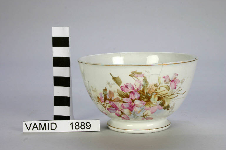 Ciotola da colazione con decorazione floreale eseguita con transfer a colori sopra smalto. Cromo a fiori. Rifiniture in oro brillante lungo i bordi.