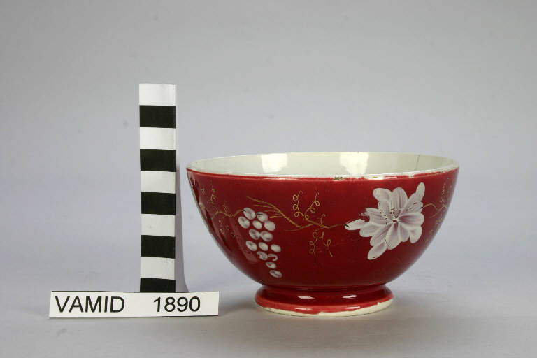 Ciotola da colazione decorata con motivo floreale eseguito in bianco e oro brillante su sfondo rosso. Rifiniture in oro brillante lungo il bordo.