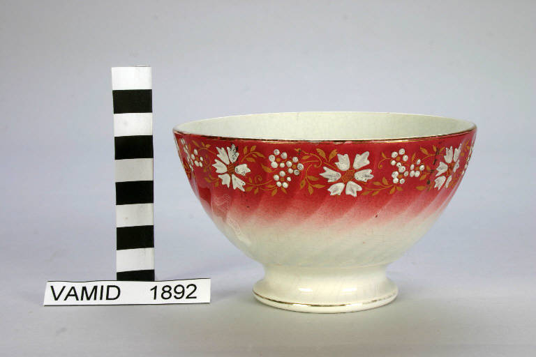 Ciotola a costolature trasversali con un piede. L'opera è decorata a smalto di colore rosa sfumato nella metà superiore e con motivi floreali stilizzati eseguiti con trasfer di colore giallo scuro e smalto bianco sul bordo. Rifiniture in oro brillante lungo il bordo superiore e lungo il piede.