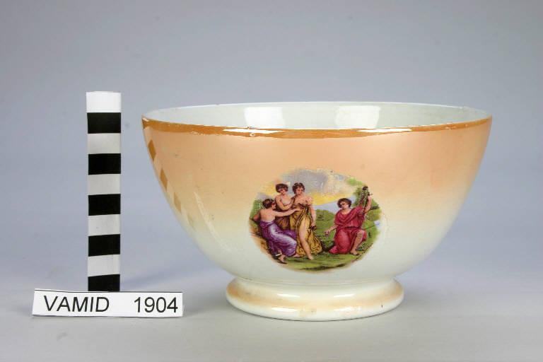 Ciotola da colazione decorata con decalcomanie litografiche applicate sopra smalto a mezza altezza su sfondo rosa pesca sfumato.