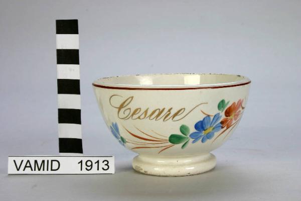 - NOTIZIE STORICO CRITICHE La ciotola da colazione, prodotta in serie, è decorata a mano con ornali floreali policromi eseguiti sotto smalto, mentre le rifiniture sono sopra smalto. Il Museo possiede diversi esemplari analoghi contrassegnati da nomi propri e l'oggetto in esame appartiene a un gruppo di sei ciotole. L'attibuzione a Piero De Ambrosis è dubitativa: l'opera è stata segnalata alla mostra "Piero e Silvio De Ambrosis decoratori", allestita a Cerro nel 1992.\nOggetti di forma simile sono presenti nelle tavole dei decori con dicitura "Tazzina Milano" (Busta 95, fascicolo 2 Archivio SCI).
