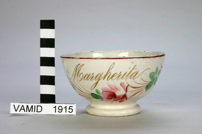 Ciotola da colazione con decorazione floreale. Nome "Margherita" in oro brillante. Rifiniture dei motivi floreali in marrone e del bordo superiore in bordeaux.