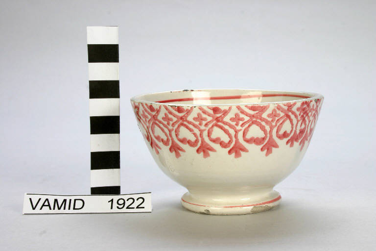 Ciotola con decorazione a motivi geometrici rosa. Filo rosa all'interno e lungo il piede.