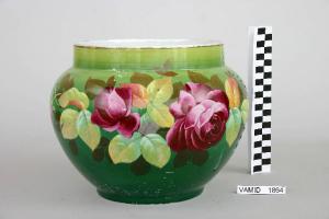 Vaso decorato a mano con una pianta di rose, su fondo di diverse tonalità di verde. Rifiniture in oro brillante lungo l'imboccatura.