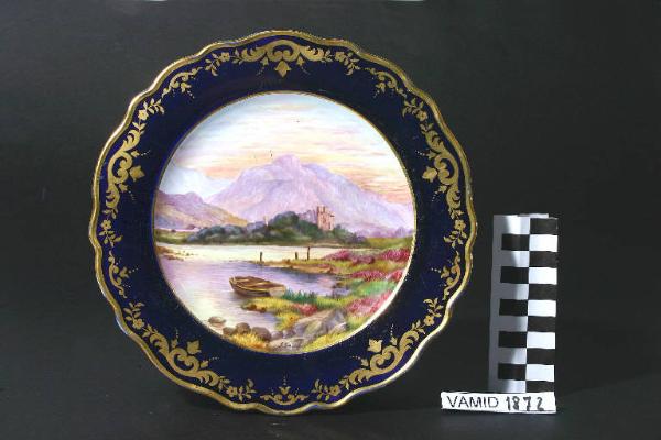 Grande piatto artistico con paesaggio lacustre. Ala di colore blu cobalto rifinita con un motivo geometrico in oro brillante.