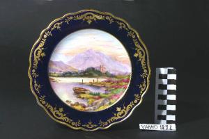 • NOTIZIE STORICO CRITICHE Il piatto di "forma reale", prodotto in un unico esemplare, è decorato a mano sotto smalto. Reca la firma dell'autrice sulla decorazione centrale. Le rifiniture in oro brillante lungo il bordo sono eseguite a terzo fuoco.