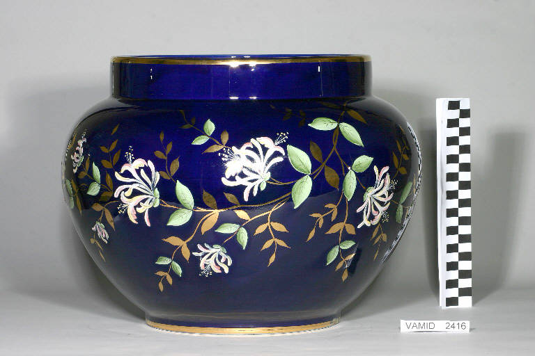 Vaso decorato con fiori di caprifoglio in oro e smalti, su fondo in smalto blu cobalto. Rifiniture in oro brillante.