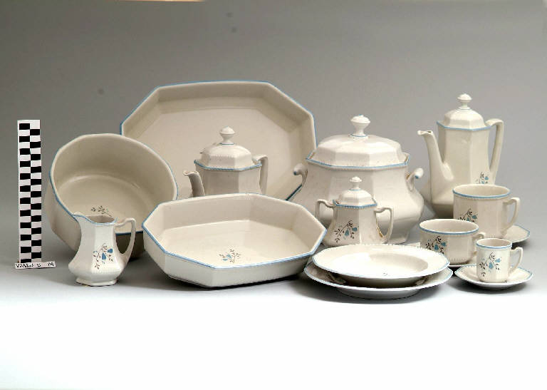 - NOTIZIE STORICO CRITICHE Il servizio da thè, composto da quattro elementi (nn. inv. 716-717, 720-721), è realizzato nella forma "Belvedere". Tipologicamente si lega ad un servizio da tavola (nn. inv. 709-714) e ad un servizio da caffè (nn. inv. 715, 718-719). Come riporta il cartellino applicato sulla pirofila da forno num. inv. 710, il servizio venne realizzato dalla Richard Ginori nella fabbrica di Laveno. Pertanto si ipotizza una datazine post 1965, anno della fusione della Richard Ginori con la S.C.I.