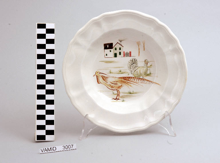 Piatto fondo circolare con tesa ondulata e bordo leggermente arcuato e modellato con una profilatura incisa; fondo color bianco avorio con animali policromi nel cavetto.