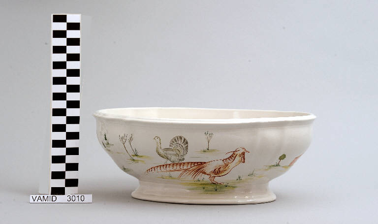 Zuppiera di forma ovale modellata con una profilatura incisa; restringimento in prossimità del piede; fondo color bianco avorio con animali policromi ai due lati.