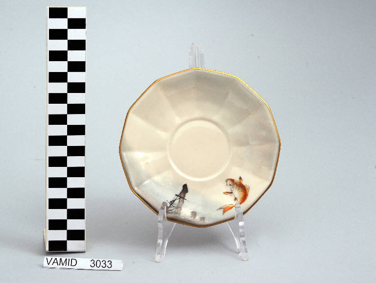 - NOTIZIE STORICO CRITICHE La foggia del piattino, appartenente ad un servizio da thè composto da ventisette elementi (num. inv. 2117...3645), suggerisce una datazione tra gli anni '30 e '40 del Novecento. La decorazione, come riporta l'iscrizione presente sul fondo di alcuni pezzi del servizio, è stata invece eseguita soprasmalto qualche anno più tardi (nel 1946) da Rosetta Tamburini, decoratrice attiva a Pesaro. Il piattino fa parte di una donazione di privati al Museo.
