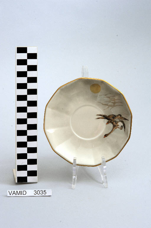 - NOTIZIE STORICO CRITICHE La foggia del piattino, appartenente ad un servizio da thè composto da ventisette elementi (num. inv. 2117...3645), suggerisce una datazione tra gli anni '30 e '40 del Novecento. La decorazione, come riporta l'iscrizione presente sul fondo di alcuni pezzi del servizio, è stata invece eseguita soprasmalto qualche anno più tardi (nel 1946) da Rosetta Tamburini, decoratrice attiva a Pesaro. Il piattino fa parte di una donazione di privati al Museo.