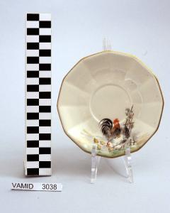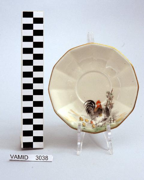 - NOTIZIE STORICO CRITICHE La foggia del piattino, appartenente ad un servizio da thè composto da ventisette elementi (num. inv. 2117...3645), suggerisce una datazione tra gli anni '30 e '40 del Novecento. La decorazione, come riporta l'iscrizione presente sul fondo di alcuni pezzi del servizio, è stata invece eseguita soprasmalto qualche anno più tardi (nel 1946) da Rosetta Tamburini, decoratrice attiva a Pesaro. Il piattino fa parte di una donazione di privati al Museo.
