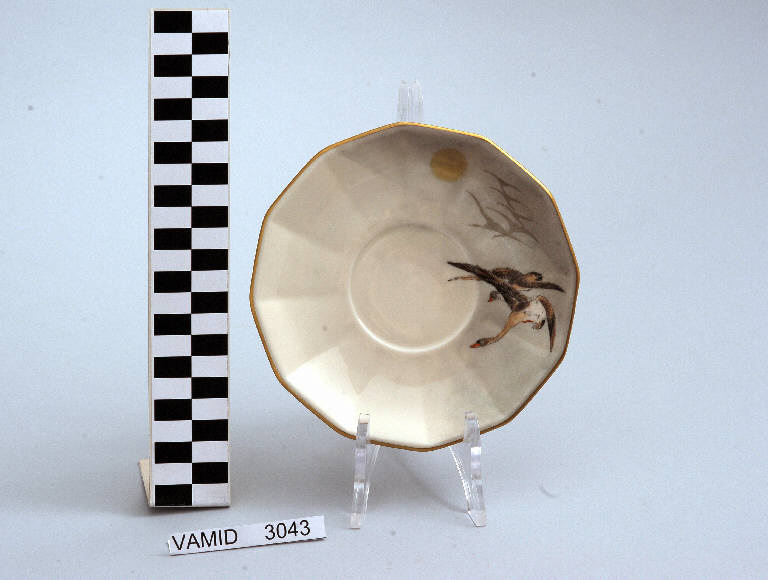 - NOTIZIE STORICO CRITICHE La foggia del piattino, appartenente ad un servizio da thè composto da ventisette elementi (num. inv. 2117...3645), suggerisce una datazione tra gli anni '30 e '40 del Novecento. La decorazione, come riporta l'iscrizione presente sul fondo di alcuni pezzi del servizio, è stata invece eseguita soprasmalto qualche anno più tardi (nel 1946) da Rosetta Tamburini, decoratrice attiva a Pesaro. Il piattino fa parte di una donazione di privati al Museo.