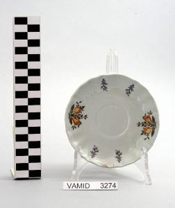 Piattino da caffè con bordo ondulato; fondo bianco con motivo decorativo vegetale policromo disposto regolarmente lungo il bordo.