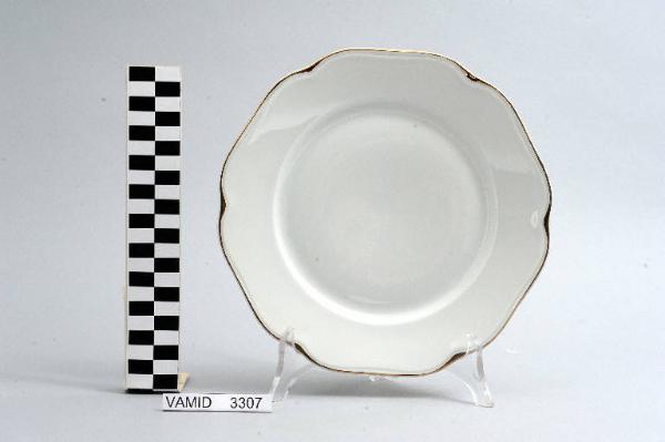 • NOTIZIE STORICO CRITICHE L'oggetto in esame, appartenente ad un servizio da tavola composto da cinquantaquattro elementi (num. inv. 3102...3565), rientra in una tipologia di vasellame di gusto popolare. Il design sobrio ed elegante, una linea ondulata e il bordo sottolineato da una filettatura oro denotano una ricerca stilistica riferibile alla metà del Novecento. La ditta produttrice, denominata "Società Ceramica del Verbano", venne fondata nel 1924 per competere con la porcellana di Doccia. Malgrado la qualità materica e formale dei suoi servizi, la "Verbano", non ebbe mai sul mercato della porcellana la potenza e l'inventiva della Ginori. Il piatto fa parte di una donazione di privati al Museo.