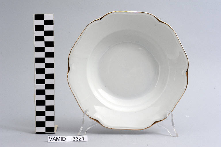 Piatto fondo esalobato di colore bianco; bordo ondulato rifinito con filettatura oro.