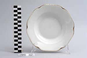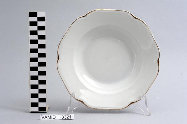 - NOTIZIE STORICO CRITICHE L'oggetto in esame, appartenente ad un servizio da tavola composto da cinquantaquattro elementi (num. inv. 3102...3565), rientra in una tipologia di vasellame di gusto popolare. Il design sobrio ed elegante, una linea ondulata e il bordo sottolineato da una filettatura oro denotano una ricerca stilistica riferibile alla metà del Novecento. La ditta produttrice, denominata "Società Ceramica del Verbano", venne fondata nel 1924 per competere con la porcellana di Doccia. Malgrado la qualità materica e formale dei suoi servizi, la "Verbano", non ebbe mai sul mercato della porcellana la potenza e l'inventiva della Ginori. Il piatto fa parte di una donazione di privati al Museo.