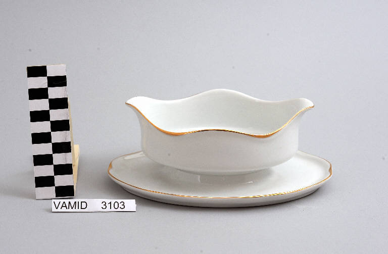 Salsiera con recipiente fissato a piattino raccogligoccia con orlo ondulato; fondo bianco rifinito con filettatura oro.
