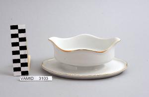 - NOTIZIE STORICO CRITICHE L'oggetto in esame, appartenente ad un servizio da tavola composto da cinquantaquattro elementi (num. inv. 3102...3565), rientra in una tipologia di vasellame di gusto popolare. Il design sobrio ed elegante, una linea ondulata e il bordo sottolineato da una filettatura oro denotano una ricerca stilistica riferibile alla metà del Novecento. La ditta produttrice, denominata "Società Ceramica del Verbano", venne fondata nel 1924 per competere con la porcellana di Doccia. Malgrado la qualità materica e formale dei suoi servizi, la "Verbano", non ebbe mai sul mercato della porcellana la potenza e l'inventiva della Ginori. La salsiera fa parte di una donazione di privati al Museo.