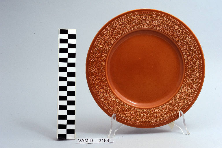 Piatto piano circolare fondo color terracotta; motivi decorativi geometrici e vegetali a rilievo lungo la tesa.