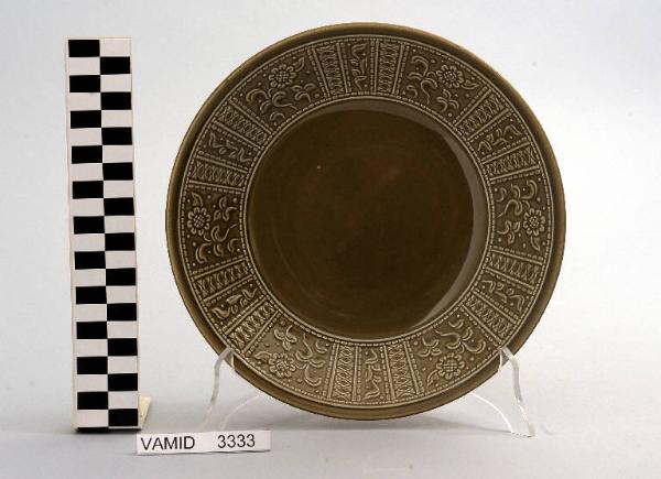 Piatto fondo circolare color marrone; motivi decorativi geometrici e vegetali a rilievo lungo la tesa.