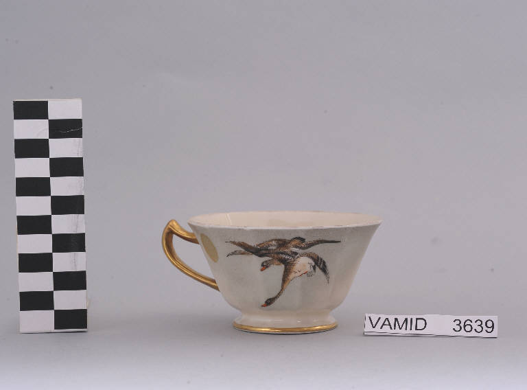 - NOTIZIE STORICO CRITICHE La foggia della tazza, appartenente ad un servizio da thè composto da ventisette elementi (num. inv. 2117...3645), suggerisce una datazione tra gli anni '30 e '40 del Novecento. La decorazione, come riporta l'iscrizione presente sul fondo di alcuni pezzi del servizio, è stata invece eseguita soprasmalto qualche anno più tardi (nel 1946) da Rosetta Tamburini, decoratrice attiva a Pesaro. La tazza fa parte di una donazione di privati al Museo.