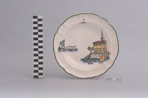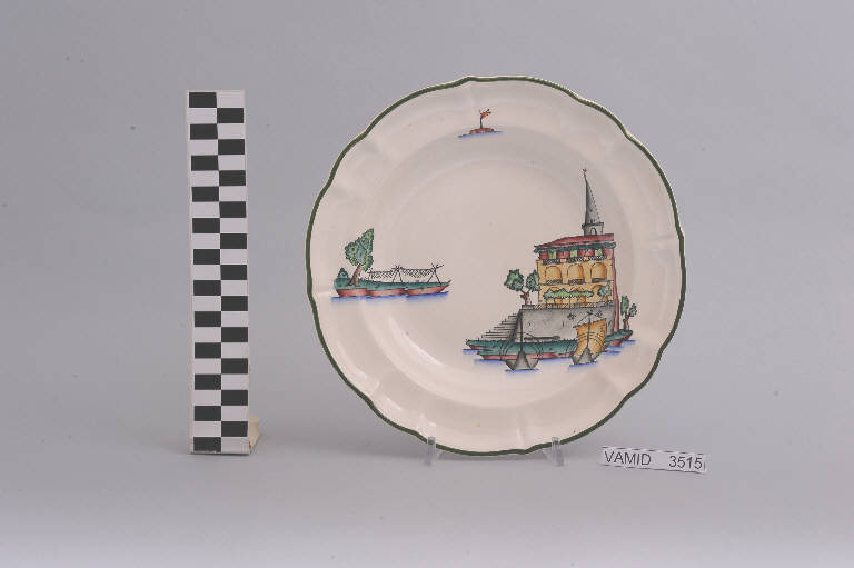 - NOTIZIE STORICO CRITICHE Il piatto, in serie con altri aventi decori diversi, fa parte di un servizio da tavola della forma "Vecchio Milano" con decoro "Lago Maggiore" n. 6641 (num. inv. 2051...3517). In questo esemplare sono raffigurati la veduta dell'Isola dei Pescatori con il campanile della chiesa svettante dalle case e due barche da pesca e alcuni elementi caratteristici della vita sul lago (le reti ad a"S.C.I."ugare sulla riva e una boa segnaletica con bandierina), rappresentati in un'atmosfera sospesa e silenziosa, seppur ridente nella resa stilizzata e nel fresco cromatismo delle raffigurazioni. In terraglia forte il servizio "Vecchio Milano" venne prodotto dalla "S.C.I." a partire dal 1923. Il fatto che il decoro "Lago Maggiore" non sia riportato sul catalogo del 1926 induce a pensare che sia stato creato dall'Andlovitz dopo questa data. La sua ideazione, pertanto, viene a collocarsi molto probabilmente tra il 1926 e il 1927, cioè tra il catalogo aziendale e la nascita della nuova forma per la III Biennale di Monza. Nel 1931 l'Andlovitz, che fin dalla sua nomina a direttore artistico si prefisse di rigenerare le forme tradizionali con decori nuovi, adattò alla forma "Vecchio Milano" il nuovissimo decoro "Lago Maggiore", a conferma che una decorazione nuova, se concepita organicamente, può conferire un aspetto attuale e "scattante" anche a una bella forma tradizionale. Nell'ambito dei repertori decorativi creati dall'Andlovitz il decoro "Lago Maggiore" rappresenta un modo frazionato di raffigurare il paesaggio, definito da Mario Munari a "scena spezzata". L'impianto decorativo di queste ceramiche rifugge dalla centralità e dalle strutturazioni lungo direttrici ortogonali, mentre vi predominano l'asimmetria e le fughe visuali sghembe che risentono del gusto per la cineseria e il giapponismo. La semplificazione geometrica degli elementi e il modo di sfumare i corpi nel'intento di suggerirne la volumetria ricorda le opere di Carlo Carrà degli anni venti. Nel decoro "Lago Maggiore" sono presenti espressioni diversificate di un tema molto caro a Guido Andlovitz: i "paesaggi d'acqua" con particolare ricorrenza delle 'barche' raffigurate in una vasta gamma di tipi, generalmente riprese da modelli reali e con divertenti variazioni fantastiche. Il decoro "Lago" fu applicato in un primo momento sulla forma "Vecchio Milano", poi sulla forma "Pomezia" (1936 ca.). Di tale decoro esistono diversi disegni originali a matita, pastello, inchiostro e acquerello su carta conservati nel fondo archivistico della "S.C.I.": alcuni di questi raffigurano il decoro proprio sulla forma "Vecchio Milano" con le rifiniture che compaiono sui pezzi finiti. Nel Museo sono conservati anche un servizio da tavola (num. inv. 2667...2911) e un servizio da caffè (num. inv. 2672...2900) forma "Vecchio Milano" con decoro "Lago Maggiore" con filettaura policroma. Negli anni '90 la Richard Ginori ha rimesso in produzione il servizio "Lago". \nIl servizio in esame è eseguito a colaggio, mentre i decori sono realizzati a decalcomania e dipinti a mano: si vedano a tal proposito le lastre in rame acciaiato conservate nel Midec e raffiguranti molti dei decori presenti nel servizio in combinazioni diversificate (nn. inv. 2480, 2483, 2484, 2485).\nIl piatto fa parte di una donazione di privati al Museo (Bellorini e Porta, 2003).