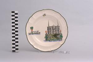 - NOTIZIE STORICO CRITICHE Il piatto, in serie con altri aventi decori diversi, fa parte di un servizio da tavola della forma "Vecchio Milano" con decoro "Lago Maggiore" n. 6641 (num. inv. 2051...3517). In questo esemplare sono raffigurati la veduta del Ninfeo nell'Isola Bella e alcuni elementi caratteristici della vita sul lago (la balaustrata con vaso decorativo tipici di tanti giardini storici che si affacciano sul lago e il frutto del limone), rappresentati in un'atmosfera sospesa e silenziosa, seppur ridente nella resa stilizzata e nel fresco cromatismo delle raffigurazioni. In terraglia forte il servizio "Vecchio Milano" venne prodotto dalla "S.C.I." a partire dal 1923. Il fatto che il decoro "Lago Maggiore" non sia riportato sul catalogo del 1926 induce a pensare che sia stato creato dall'Andlovitz dopo questa data. La sua ideazione, pertanto, viene a collocarsi molto probabilmente tra il 1926 e il 1927, cioè tra il catalogo aziendale e la nascita della nuova forma per la III Biennale di Monza. Nel 1931 l'Andlovitz, che fin dalla sua nomina a direttore artistico si prefisse di rigenerare le forme tradizionali con decori nuovi, adattò alla forma "Vecchio Milano" il nuovissimo decoro "Lago Maggiore", a conferma che una decorazione nuova, se concepita organicamente, può conferire un aspetto attuale e "scattante" anche a una bella forma tradizionale. Nell'ambito dei repertori decorativi creati dall'Andlovitz il decoro "Lago Maggiore" rappresenta un modo frazionato di raffigurare il paesaggio, definito da Mario Munari a "scena spezzata". L'impianto decorativo di queste ceramiche rifugge dalla centralità e dalle strutturazioni lungo direttrici ortogonali, mentre vi predominano l'asimmetria e le fughe visuali sghembe che risentono del gusto per la cineseria e il giapponismo. La semplificazione geometrica degli elementi e il modo di sfumare i corpi nel'intento di suggerirne la volumetria ricorda le opere di Carlo Carrà degli anni venti. Nel decoro "Lago Maggiore" sono presenti espressioni diversificate di un tema molto caro a Guido Andlovitz: i "paesaggi d'acqua" con particolare ricorrenza delle 'barche' raffigurate in una vasta gamma di tipi, generalmente riprese da modelli reali e con divertenti variazioni fantastiche. Il decoro "Lago" fu applicato in un primo momento sulla forma "Vecchio Milano", poi sulla forma "Pomezia" (1936 ca.). Di tale decoro esistono diversi disegni originali a matita, pastello, inchiostro e acquerello su carta conservati nel fondo archivistico della "S.C.I.": alcuni di questi raffigurano il decoro proprio sulla forma "Vecchio Milano" con le rifiniture che compaiono sui pezzi finiti. Nel Museo sono conservati anche un servizio da tavola (num. inv. 2667...2911) e un servizio da caffè (num. inv. 2672...2900) forma "Vecchio Milano" con decoro "Lago Maggiore" con filettaura policroma. Negli anni '90 la Richard Ginori ha rimesso in produzione il servizio "Lago". \nIl servizio in esame è eseguito a colaggio, mentre i decori sono realizzati a decalcomania e dipinti a mano: si vedano a tal proposito le lastre in rame acciaiato conservate nel Midec e raffiguranti molti dei decori presenti nel servizio in combinazioni diversificate (nn. inv. 2480, 2483, 2484, 2485).\nIl piatto fa parte di una donazione di privati al Museo (Bellorini e Porta, 2003).
