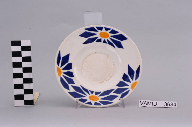 • NOTIZIE STORICO CRITICHE Il piattino in esame appartiene ad un servizio da thè (num. inv. 3682-3687). Il marchio presente sul fondo è la modifica di uno degli emblemi più antichi della manifattura di Laveno e fu usato dalla Richard Ginori tra il 1971 e il 1979 per contraddistinguere i servizi in terraglia forte prodotti nello stabilimento lombardo. Il decoro è stato applicato sottosmalto con la tecnica delle mascherine. Il piattino fa parte di una donazione di privati al Museo.