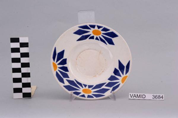 Piattino da thè circolare; fondo color avorio decorato con fiori stilizzati in blu e giallo.