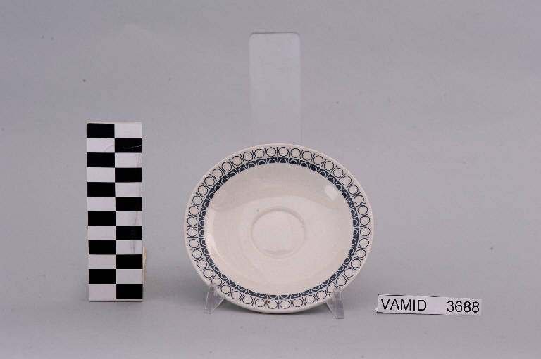 - NOTIZIE STORICO CRITICHE La foggia del manufatto in esame e la tipologia del decoro indicano una piena assimilazione della lezione del funzionalismo e quindi una datazione ormai oltre la metà del Novecento confermata anche dal marchio presente sul fondo usato dalla Richard Ginori dal 1950 al 1990 circa su tutti gli oggetti prodotti nello stabilimento di Lambrate. Il piattino, appartenente ad un servizio da caffè (num. inv. 3688-3695), fa parte di una donazione di privati al Museo.