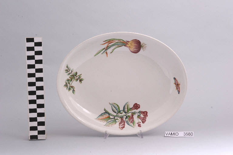 - NOTIZIE STORICO CRITICHE Il piatto da portata in esame fa parte di un servizio da tavola composto da ventidue elementi. La foggia del servizio e la tipologia del decoro indicano una datazione ben oltre la metà del Novecento confermata anche dal marchio presente sul fondo usato dalla Richard Ginori nello stabilimento di Laveno Ponte dal 1966 al 1975 circa. Il motivo ornamentale, eseguito soprasmalto, è costituto da fiori, ortaggi (cipolla) e farfalla. Il piatto fa parte di una donazione di privati al Museo.