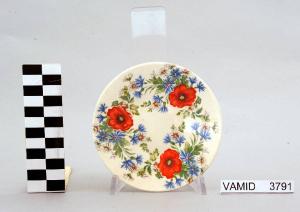• NOTIZIE STORICO CRITICHE Il piattino in esame, appartenente ad un servizio da caffè (num inv. 3787...3805), presenta un motivo floreale di tipo tradizionale, costituito da bouquets di papaveri, violette e margherite disposti regolarmente, reso con morbidi effetti di chiaroscuro e con una policromia ricca e sfumata realizzata con la tecnica della decalcomania soprasmalto. La foggia del manufatto, utilizzata sia nelle manifatture italiane come la "S.C.I" che in quelle europee come la "Villeroy & Boch", confermerebbe la datazione al 1950-1960 ca. Nel Midec sono conservati un servizio da thè realizzato nella forma "C 205" progettata da Antonia Campi (num inv. 3781...3807) e un vasetto (num. inv. 3150) che presentano il medesimo motivo ornamentale. Il piattino fa parte di una donazione di privati al Museo.