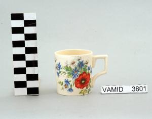 Tazzina da caffè di forma cilindrica con manico squadrato; fondo bianco con decoro floreale policromo disposto regolarmente all'esterno.