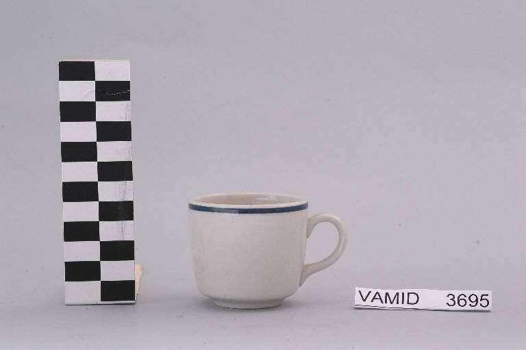 - NOTIZIE STORICO CRITICHE La foggia del manufatto in esame e la tipologia del decoro dei due piattini che completano il servizio (nn. inv. 3688, 3689) indicano una piena assimilazione della lezione del funzionalismo e quindi una datazione ormai oltre la metà del Novecento confermata anche dal marchio presente sul fondo usato dalla Richard Ginori dal 1950 al 1990 circa su tutti gli oggetti prodotti nello stabilimento di Lambrate. La tazzina, appartenente ad un servizio da caffè (num. inv. 3688-3695), fa parte di una donazione di privati al Museo.