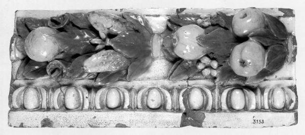 Il frammento, in terracotta smaltata, è un segmento modulare di una cornice a sguancio decorato con una ghirlanda lavorata in rilievo. Il lato destro, più esterno, ha una modanatura a ovoli e dardi smaltati con cromie bianche, mentre la fascia scanalata ha due mazzi vegetali con cromie naturalistiche: il primo è composto da due mele, due roselline bianche e un limone con relative foglie; il secondo è composto da due cetrioli, un fiore giallo, probabilmente una celidonia, due campanule azzurre e un'arancia con foglie relative.