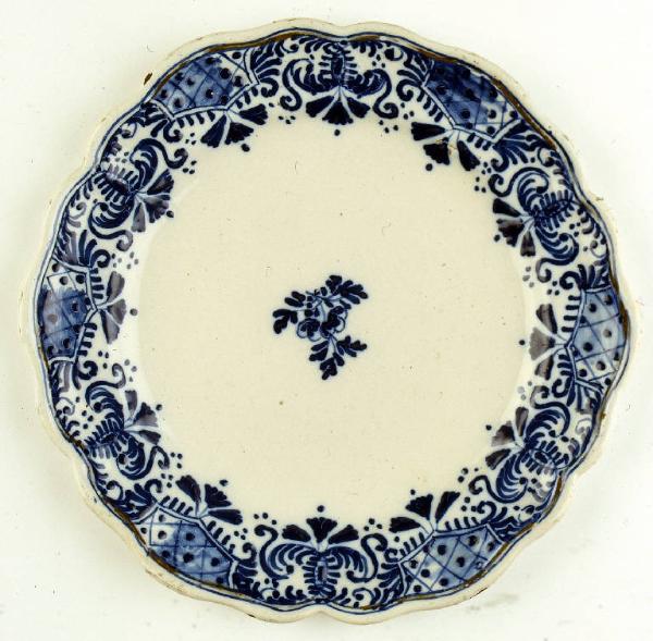Piatto esalobato con contorno mistilineo, corta balza e fondo piano, senza cercine. La parete è rivestita da uno smalto coprente, pannoso con una decorazione in monocromia leggermente rilevata dalla superficie, a modi ricamo a punto pieno. L'ornato presenta, lungo l'orlo, riserve a graticcio che si alternano con farfalle, formate dall'intersecarsi delle "C"; al centro, un piccolo fiore dipinto, accompagnato da corti steli fogliati.
