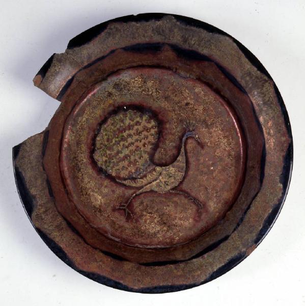 - NOTIZIE STORICO CRITICHE Il piatto è stato realizzato a Faenza, all'inizio degli anni trenta del XX secolo, da Pietro Melandri. Esso è un raro esempio dei legami dell'artista con la tradizione ceramica, tradizione che abbandonerà progressivamente per aderire alla grande plastica italiana. \nL'opera sembra essere un omaggio voluto ad alcuni archetipi della ceramica italiana, attestati sin dalla fase medievale, l'uso della forma a bacile e il tema del pavone; ancora, è alla cultura orientale, e all'aspetto tecnico a lei peculiare, il lustro metallico, che Melandri guarda nella realizzazione di questo piatto.