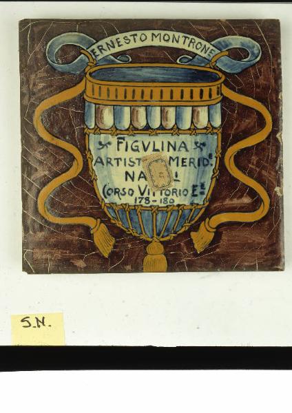 Grande mattonella quadrata, di notevole spessore, smaltata sul recto, con tracce di colore che continua lungo i margini bisellati. \nLa decorazione mostra una lunga iscrizione "FIGULINA/ARTISTICA MERID./NAPOLI (CORSO VITTORIO E./175/180)", e, in alto, un cartiglio che recita "ERNESTO MONTRONE".
