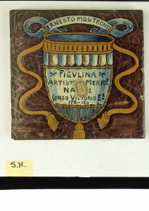 - NOTIZIE STORICO CRITICHE La mattonella è stata realizzata, nel 1906, nel laboratorio napoletano Figulina Artistica Meridionale di Ernesto Montrone. \nLa piastrella insieme con altre sette, replica gli esemplari appartenuti al pavimento dello studiolo di Isabella d'Este a Mantova, realizzati presso la bottega di Antonio Fedeli di Pesaro tra il 1493 e il 1494, oggi conservati in diverse raccolte pubbliche, tra cui il Museo d'Arti Applicate del Castello Sforzesco. \nErnesto Montrone fu attivo, dapprima come allievo, poi in veste di capo dell'officina della ceramica, per oltre trent'anni, presso il Museo Artistico Industriale di Napoli. Di lui, immeritatamente poco noto, si perdono le tracce a seguito dello scoppio della prima guerra mondiale.