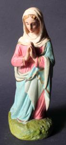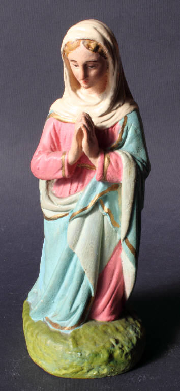 Madonna inginocchiata con le mani giunte. Indossa una veste rosa, un mantello azzurro ed un velo bianco.