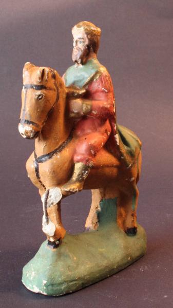 Re Magio giovane in sella ad un cavallo ocra. Nella mano sinistra reca un dono.
