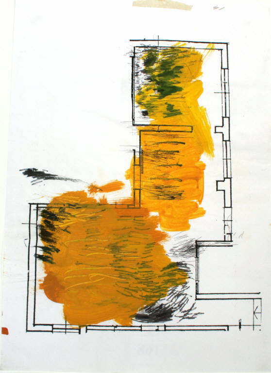 disegno a tecnica mista su fotocopia: acrilico, pennarello, penna biro nera e pastello a cera. Colore: nero, giallo, grigio, verde. Soggetto: progetto per pavimento.