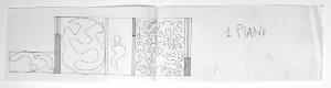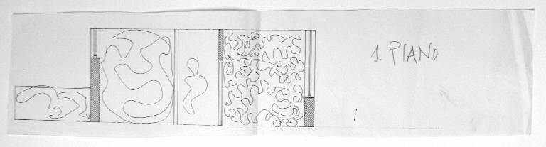 disegno a penna nera su fotocopia; colore: nero, bianco. Soggetto: progetto per decorazione parietale, i piano, sezione i.