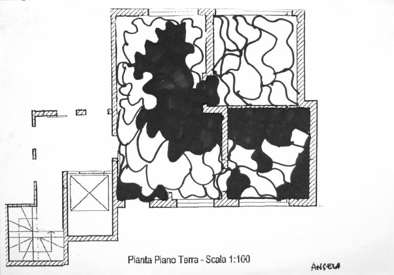 disegno a pennarello nero su fotocopia. Colore: bianco e nero. Soggetto: progetto per pavimento, piano terra. Scritta in stampatello maiuscolo: "pianta piano terra - scala 1:100" disegno firmato: Angela.