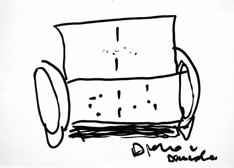 fotocopia di disegno originale a pennarello nero su carta bianca. Colore: bianco e nero. Soggetto: progetto di design con scritta al centro del foglio in pennarello nero, corsivo minuscolo: "divano a dondolo".