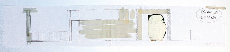 collage con scotch e pittura acrilica su carta ritagliata su fotocopia in carta bianca. Colore: bianco e nero. Soggetto: studio per decorazione parietale, sezione d, i piano. Disegno firmato e datato: Angela, 14.05.2002.