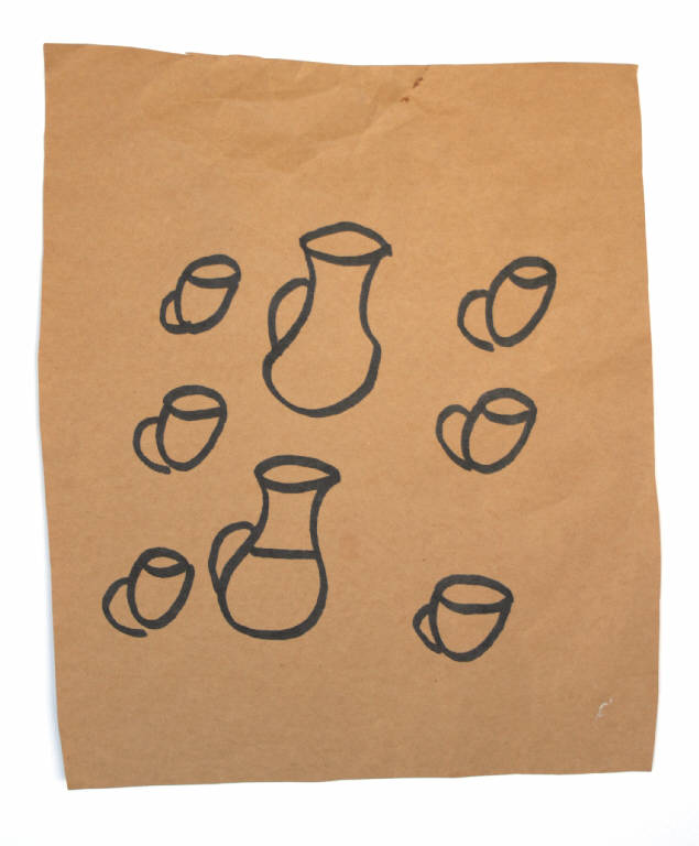 disegno a pennarello indelebile nero su carta marrone. Colore: marrone e nero. Soggetto: studio di design.