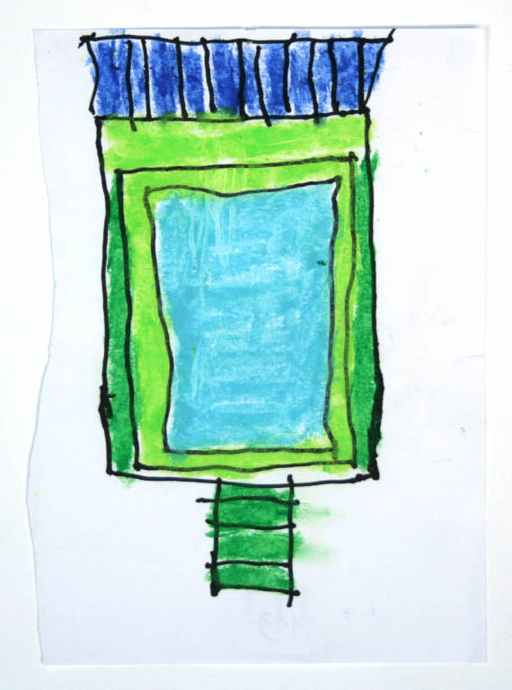 disegno a tecnica mista: pastelli a cera colorati e pennarello nero su carta bianca. Colore: celeste, azzurro, verde chiaro e scuro. Soggetto: studio decorativo. Foglio tagliato con andamento curvilineo, sul lato sinistro.